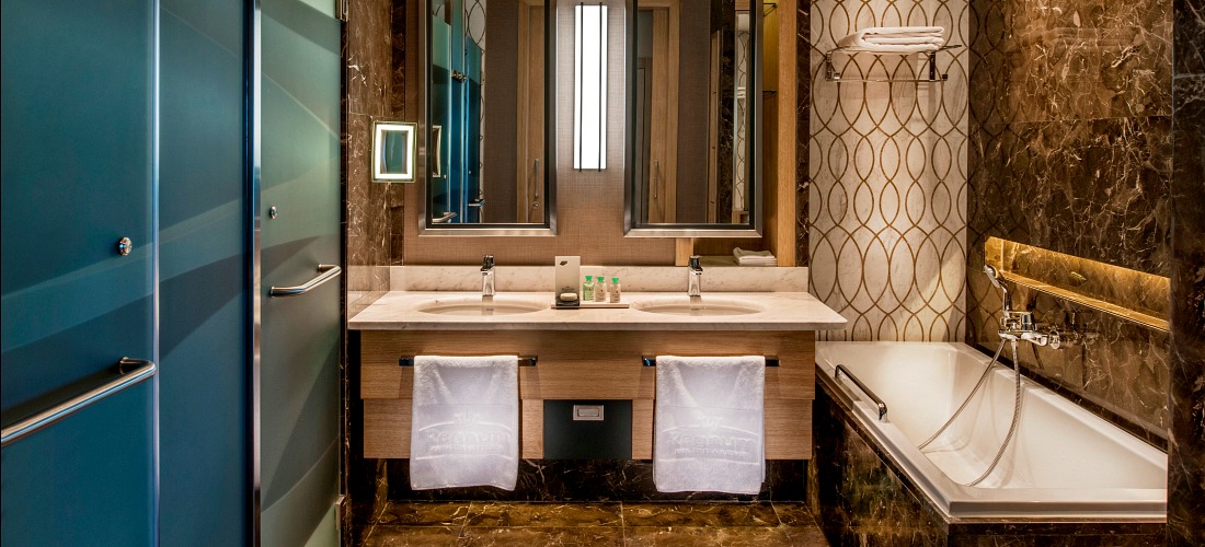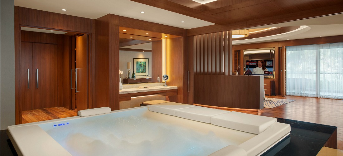 100 м² + 24 м² балкон, номер в главном здании, вид на море, спальня (1 двуспальная - одна большая кровать, 2x2,20), 2 ванные комнаты (1 ванная: туалет, душ, ванна, двойная раковина; 2 ванная: туалет и душ), гостиная, мягкая мебель, письменный стол, гардеробная, сейф, макси-бар, кондиционер, для детей(0-12) банные принадлежности, кофе машина эл.чайник (чай, кофе), утюг и гладильная доска, двa зеркальных LED телевизора. Макс размещение: 4 взр + 1 инф.