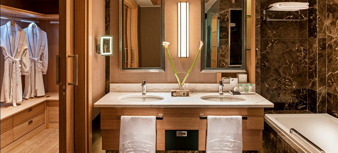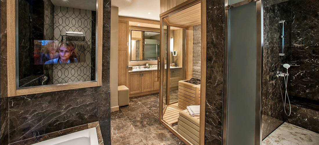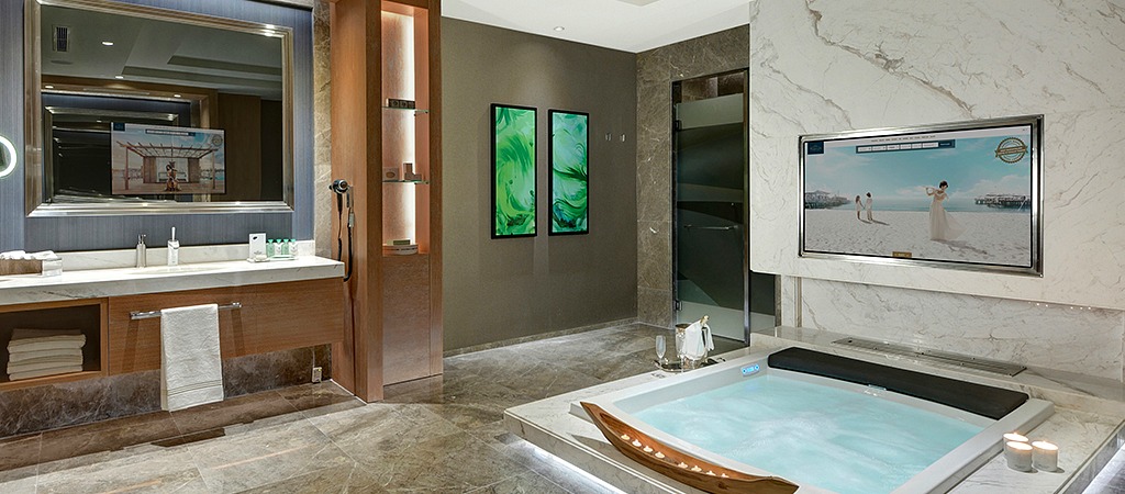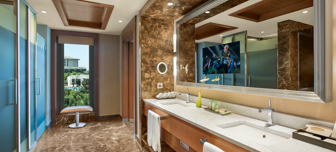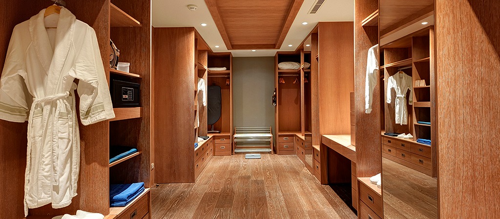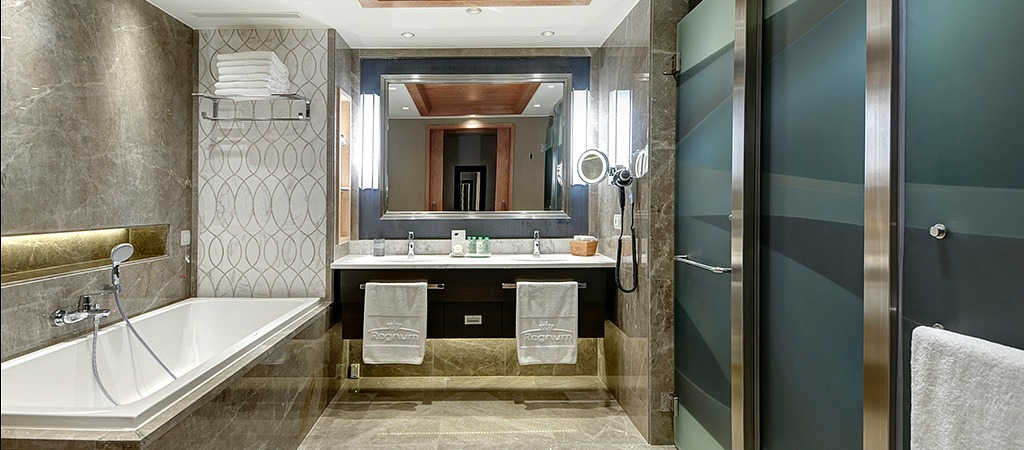 85 м² + 40 м² терраса, номер в гланом здании, 2 спальни 1 двуспальная (одна большая кровать (2 x 2,20) и две раздельные кровати (каждая 1,40x2,20)), две ванные комнаты (одна ванная: туалет, душ и ванная; вторая ванная: туалет и душ), гардеробная, мягкая мебель, сейф, мини-бар, кондиционер, для детей (0-12) ночник, переноска и банные принадлежности, эл.чайник (чай, кофе), утюг и гладильная доска, два зеркальных LED телевизора. Макс размещение: 5 взр + 1 инф.