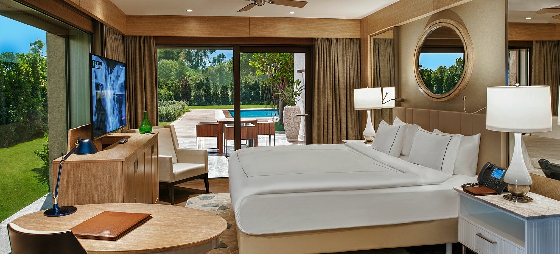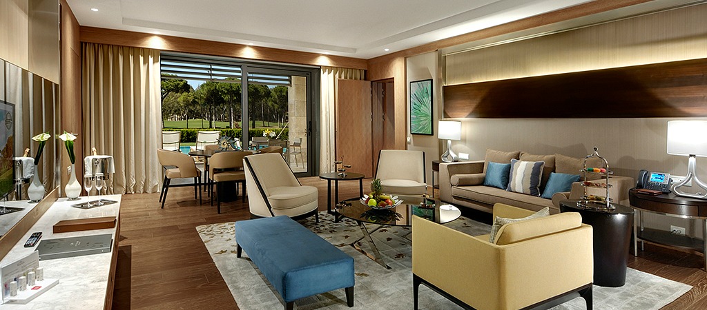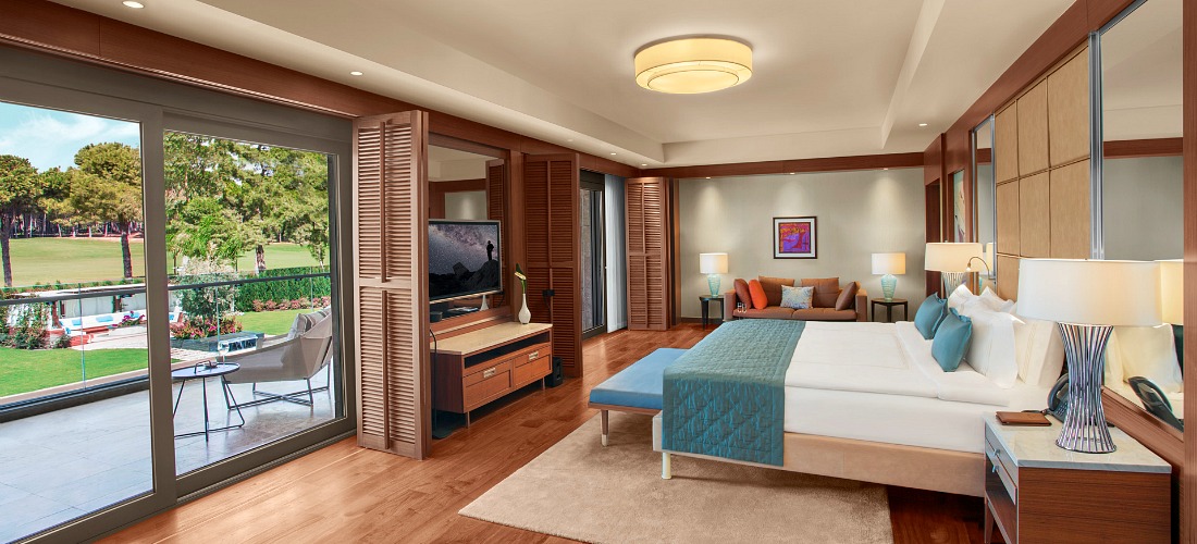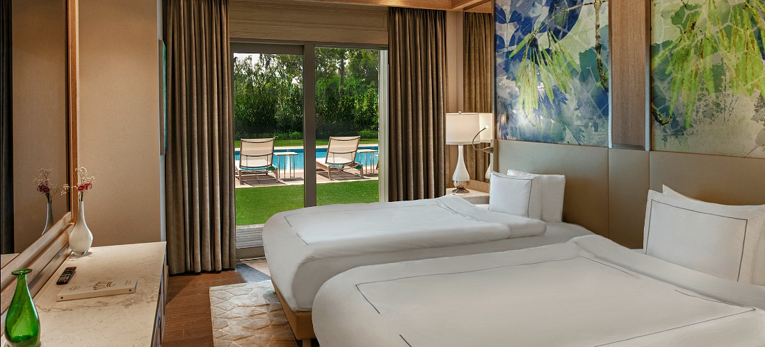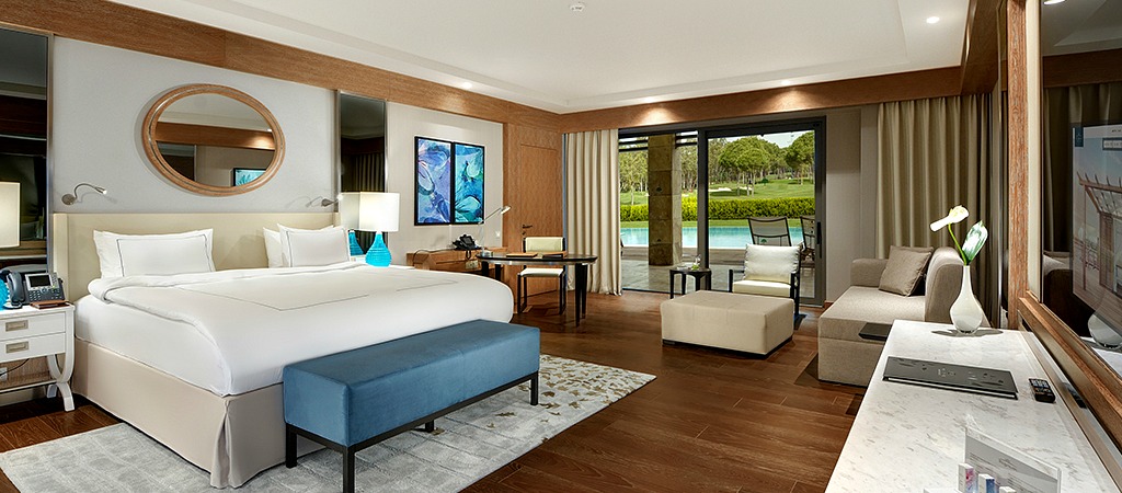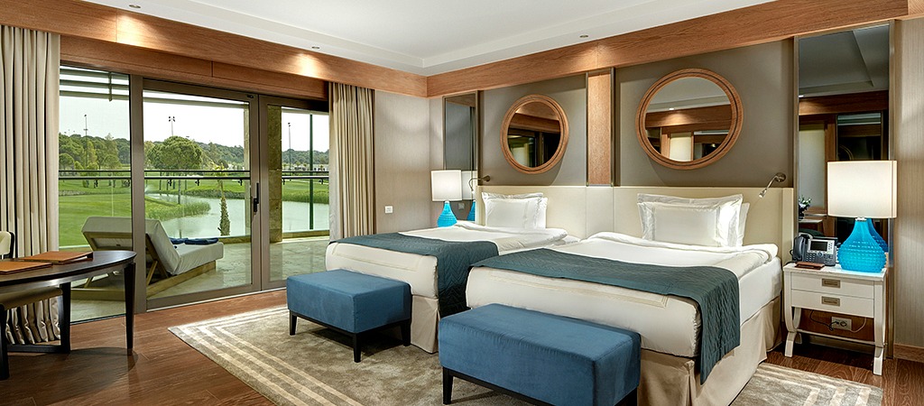 50 м² + 12 м² терраса, номер находится на территории Carya Golf Residеnce, вид на бассейн, оснащен прямым выходом к бассейну, одна спальня: 1 двуспальная или 2 односпальные кровати, ванная комната, туалет, душ, ванная, двойная раковина, мягкая мебель, письменный стол, гардеробная, зеркальный LED телевизор . Макс размещение: 3 взр + 1 инф.