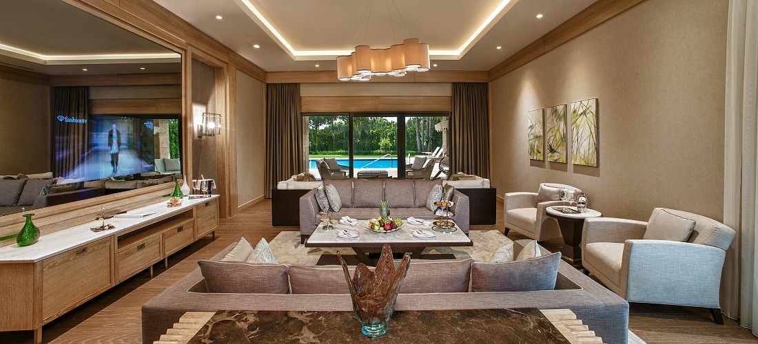 VIP-трансфер из аэропорта (аэропорт-отель-аэропорт), Fast Track и лаундж в аэропорту при вылете из Анталии международными рейсами. Заезд и VIP приветствие на вилле с цветами и шампанским, личный дворецкий. Обслуживание в номерах 24 часа по меню (питание и напитки),cьют на пирсе, личный клубная машина (багги). Привилегии при бронировании A'la Carte ресторанов, пополняемый VIP-бар.